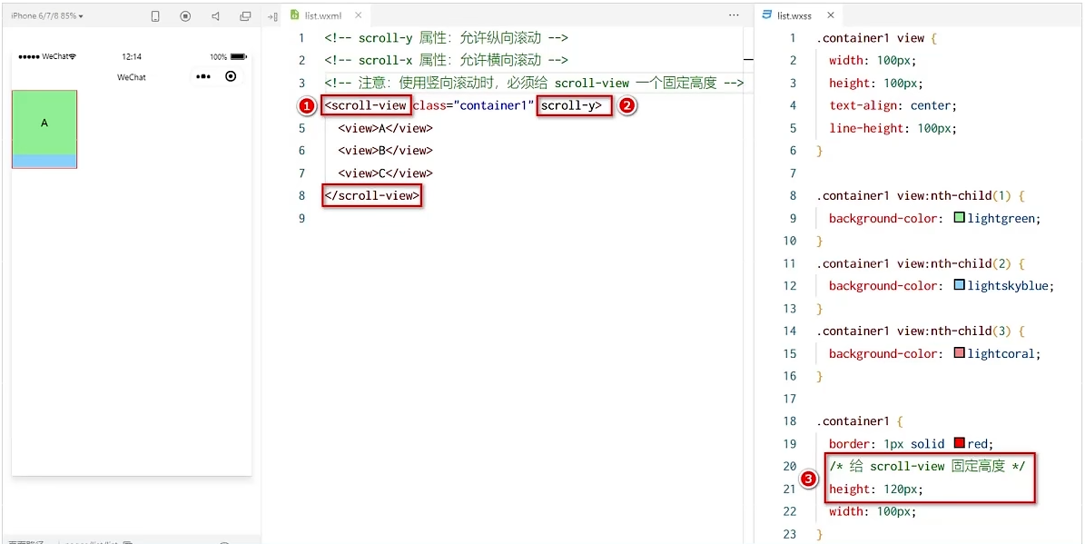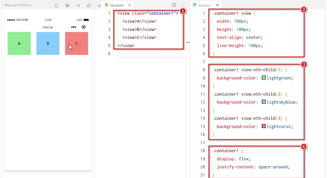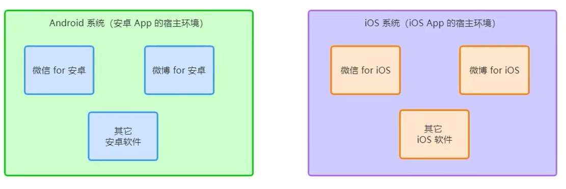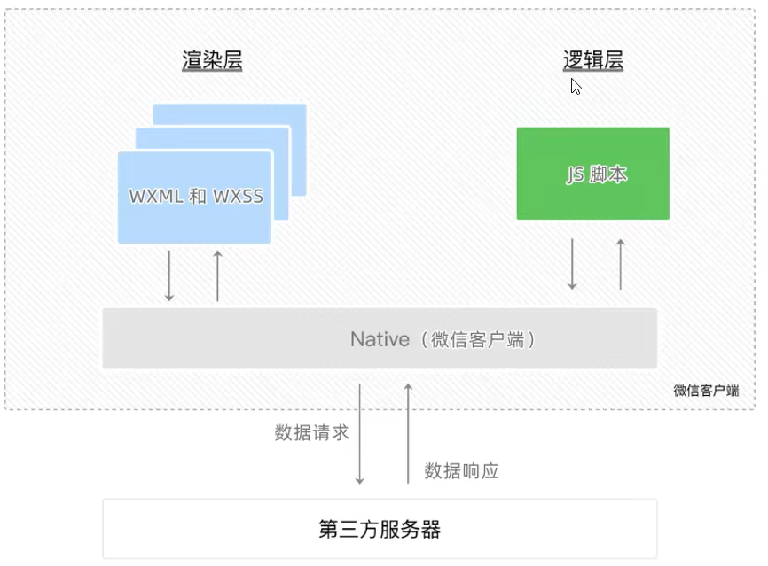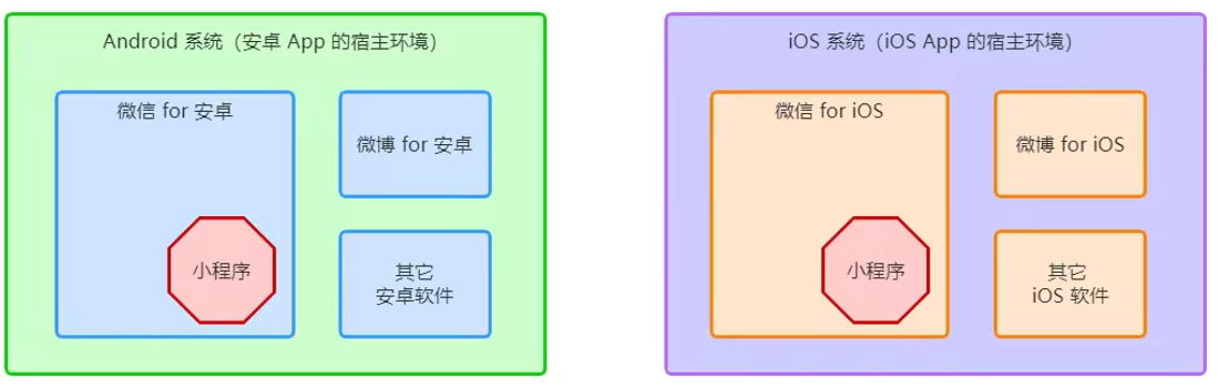 # 小程序的宿主环境 ## 宿主环境简介 >i 1. 什么是宿主环境 `宿主环境`(host environment)指的是程序运行所必须的依赖环境。 例如:`Android系统`和`IOS系统`是不同的宿主环境。安卓版的微信APP是不能再IOS环境下运行的。所以Android是安卓软件的宿主环境,`脱离了宿主环境的软件是没有任何意义的!`  >i 2. 小程序的宿主环境 `手机微信是小程序的宿主环境`,如图所示:  小程序借助宿主环境提供的能力,可以完成许多普通网页无法完成的功能。例如: 微信扫码、微信支付、微信登录、地理位置、etc... >i 3.小程序宿主环境包含的内容 - 1) 通信模型 - 2) 运行机制 - 3) 组件 - 4) API ## 通信模型 >i 1、通信主体 小程序中通信的主体是`渲染层`和`逻辑层`,其中: - 1)WXML模版和WXSS样式工作在渲染层 - 2)JS脚本工作在逻辑层  >i 2、小程序的通信模型 小程序中的通信模型分为两个部分: 1)`渲染层`和`逻辑层`之间的通信: `由微信客户端进行转发` 2)`逻辑层`和`第三方服务器`之间的通信:`由微信客户端转发`  ## 运行机制 >i 5、小程序启动的过程 - 1)把小程序的代码包下载到本地 - 2)解析app.json全局配置文件 - 3)执行app.js小程序入口,`调用app()创建小程序实例` - 4)渲染小程序首页 - 5)小程序启动完成 >i 6、页面渲染的过程 - 1)加载解析页面的.json配置文件 - 2)加载页面的.wxml模版和.wxss央视 - 3)执行页面的.js文件,`调用Page()创建页面实例` - 4)页面渲染完成 ## 组件 >i 1、小程序组件的分类 `小程序中的组件也是由宿主环境提供的`,开发者可以基于组件快速搭建出漂亮的页面结构。官方吧小程序的组件分为9大类,分别是: - `视图容器` - `基础内容` - `表单组件` - `导航组件` - 媒体组件 - map地图组件 - canvas画布组件 - 开放能力 - 无障碍访问 >i 2、常用视图容器类组件 - **view** - 普通视图区域 - 类似与HTML中的div,是一个块级元素 - 常用来实现页面的布局效果 - **scroll-view** - 可滚动的视图区域 - 常用来实现滚动列表效果 - **swiper和swiper-item** - 轮播图容器组件和轮播图item组件 >i 3、view组件基本使用 实现如图flex横向布局效果:  >i 4、scroll-view组件的基本使用 实现如图的纵向滚动效果:
